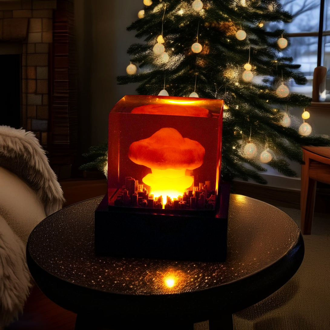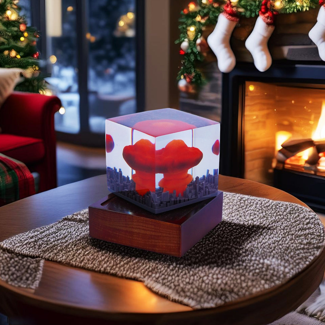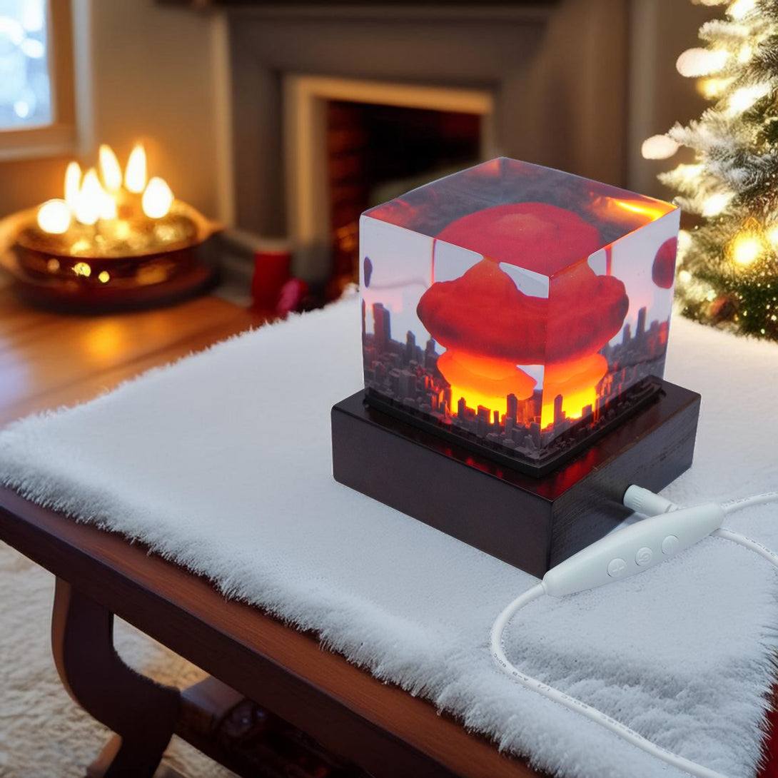 Turn your space into an unforgettable conversation starter with this mind-blowing Resin Explosion Lamp. Encased in a crystal-clear cube, this lamp captures the dramatic moment of a fiery mushroom cloud erupting over a miniature city skyline. The vivid LED lighting brings the scene to life, casting a warm, cinematic glow that feels straight out of an epic movie.